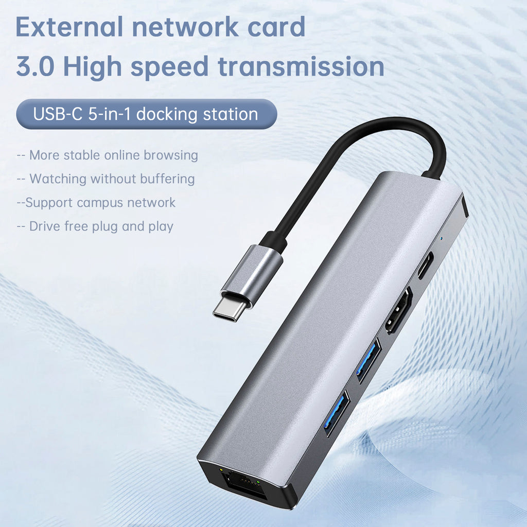 5 in 1 TYPE-C to USB3.0*1+USB2.0*1+PD100W/USB-C Data+HDMI+100M Network Card Interface Hub Adapter Dock