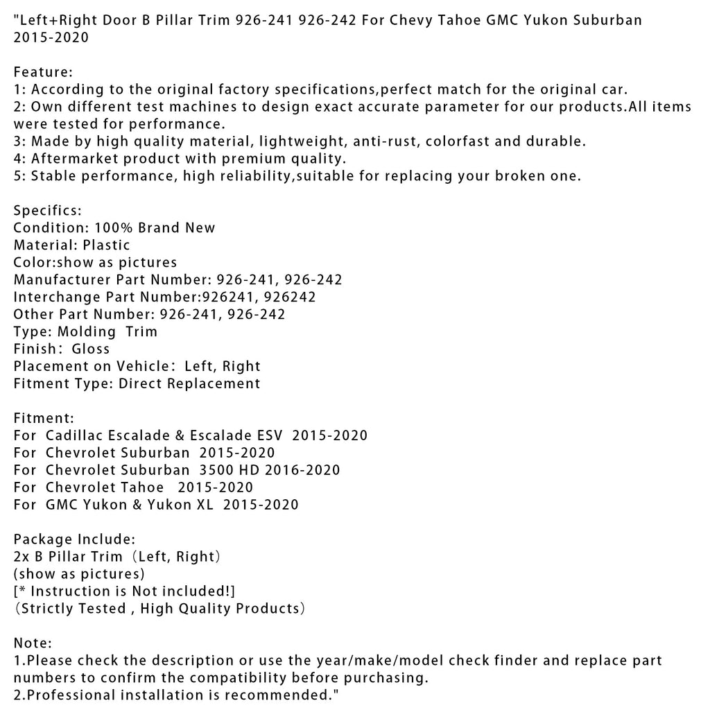 Left+Right Door B Pillar Trim 926-241 926-242 Fit For Chevy Tahoe GMC Yukon Suburban 2015-2020