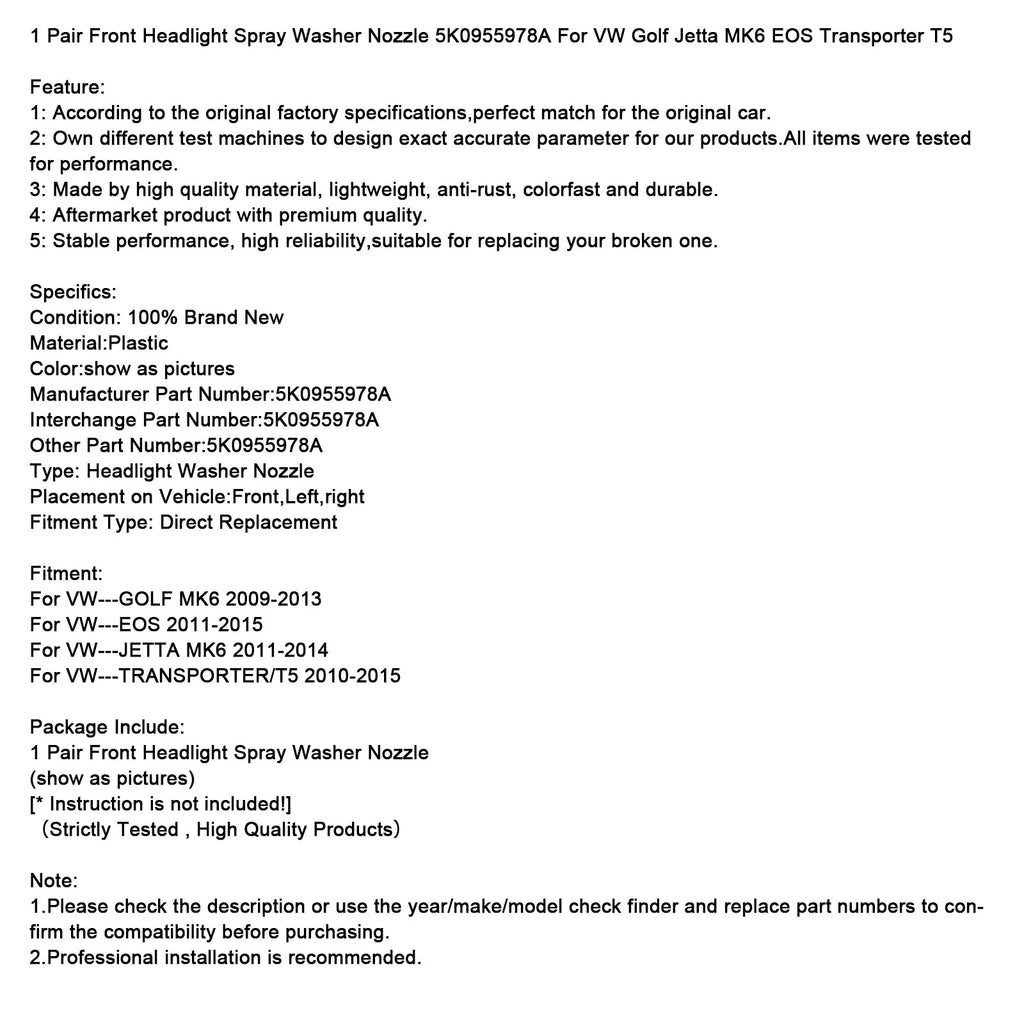 1 Pair Front Headlight Spray Washer Nozzle 5K0955978A For VW Golf Jetta MK6 EOS Transporter T5