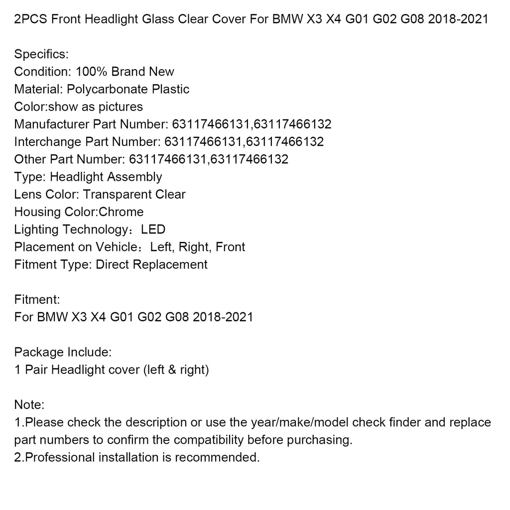 2PCS Front Headlight Glass Clear Cover For BMW X3 X4 G01 G02 G08 2018-2021