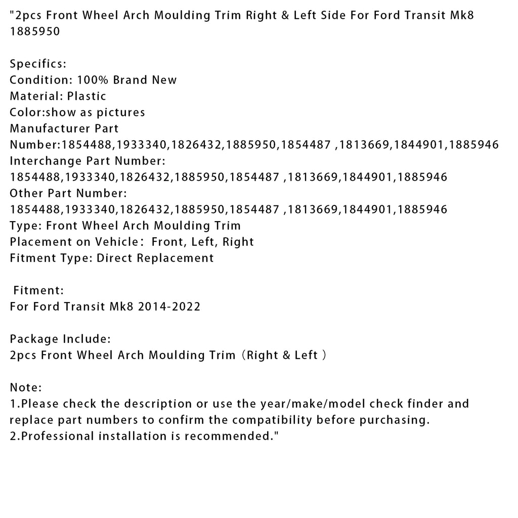 2pcs Front Wheel Arch Moulding Trim Right & Left Side For Ford Transit Mk8 1885950