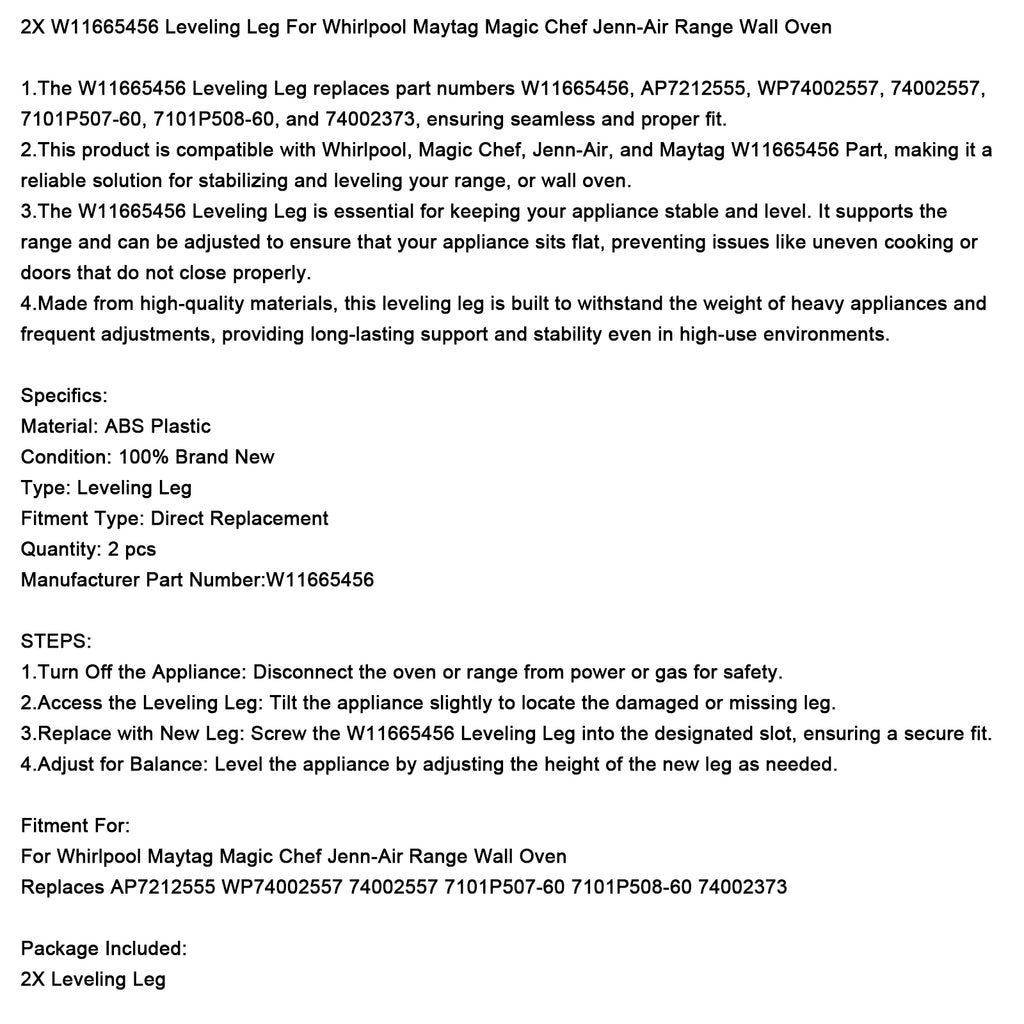 1.The W11665456 Leveling Leg replaces part numbers W11665456, AP7212555, WP74002557, 74002557, 7101P507-60, 7101P508-60, and 74002373, ensuring seamless and proper fit.