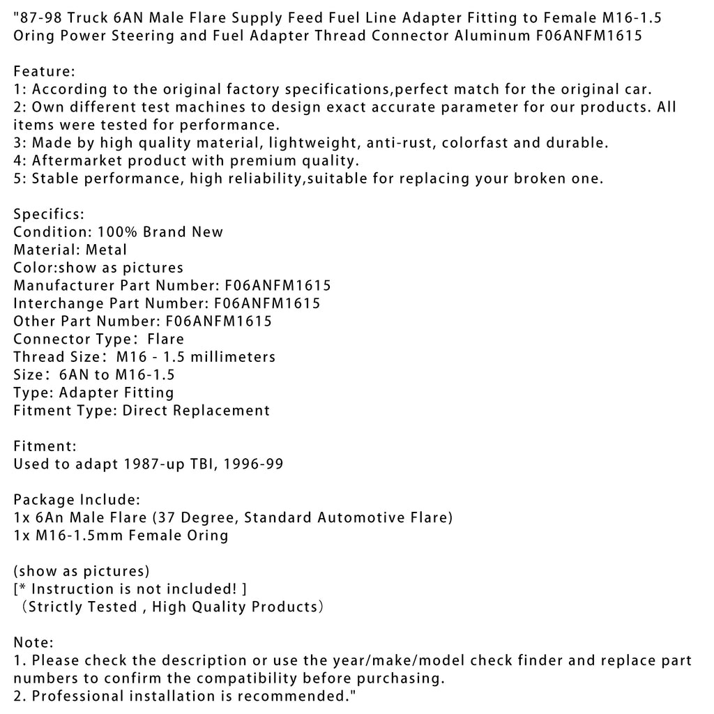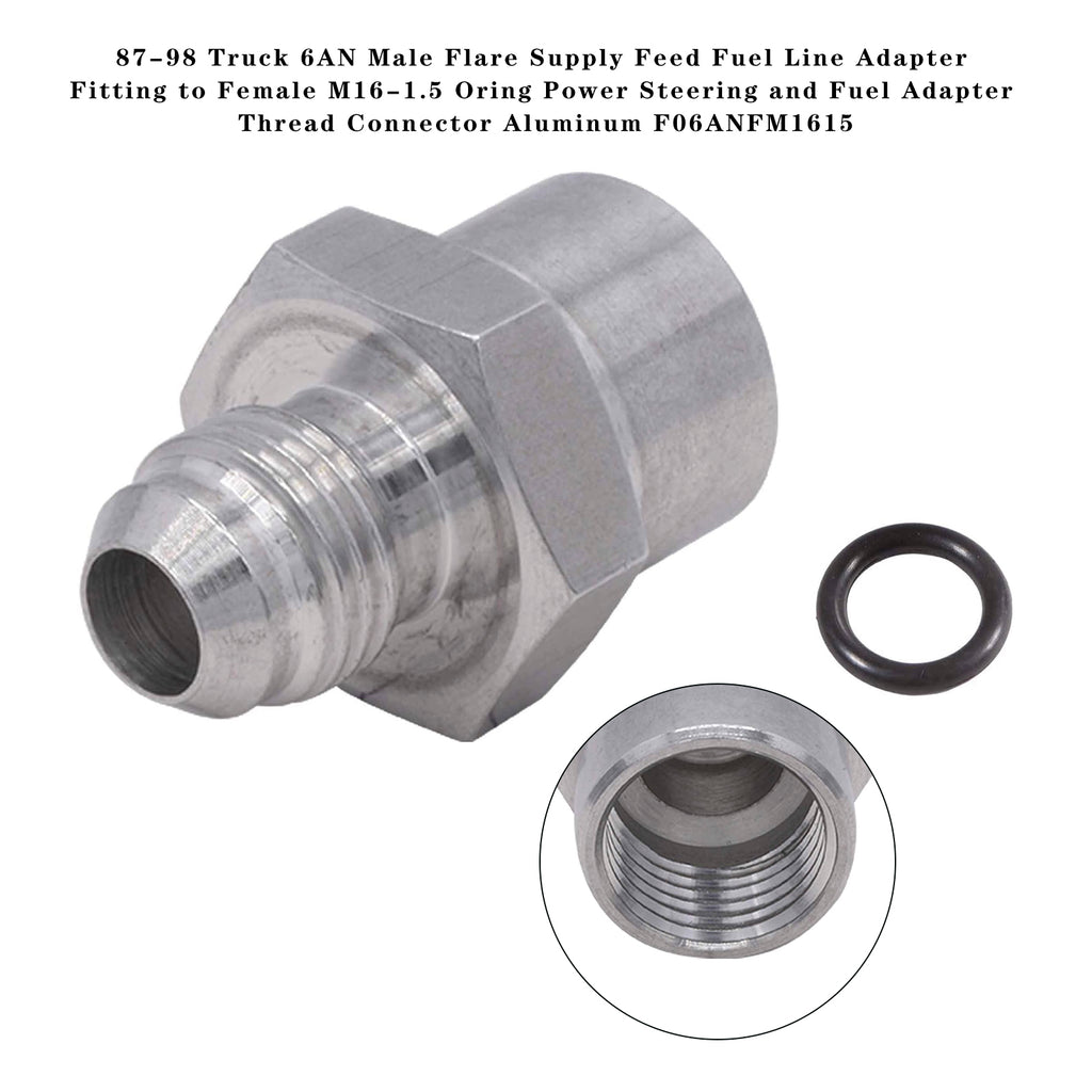 87-98 Truck 6AN Male Flare Supply Feed Fuel Line Adapter Fitting to Female M16-1.5 Oring Power Steering and Fuel Adapter Thread Connector Aluminum F06ANFM1615