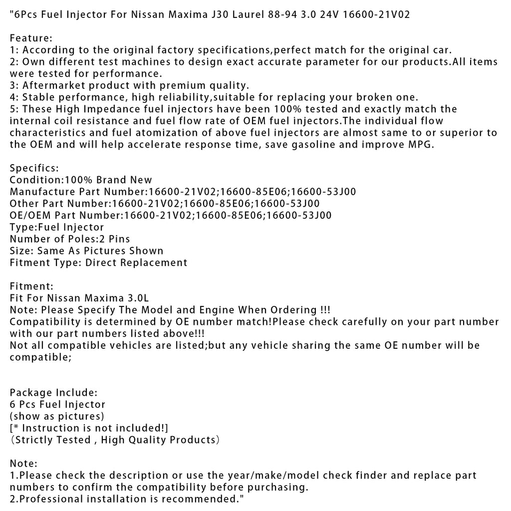 6Pcs Fuel Injector Fit For Nissan Maxima J30 Laurel 88-94 3.0 24V 16600-21V02