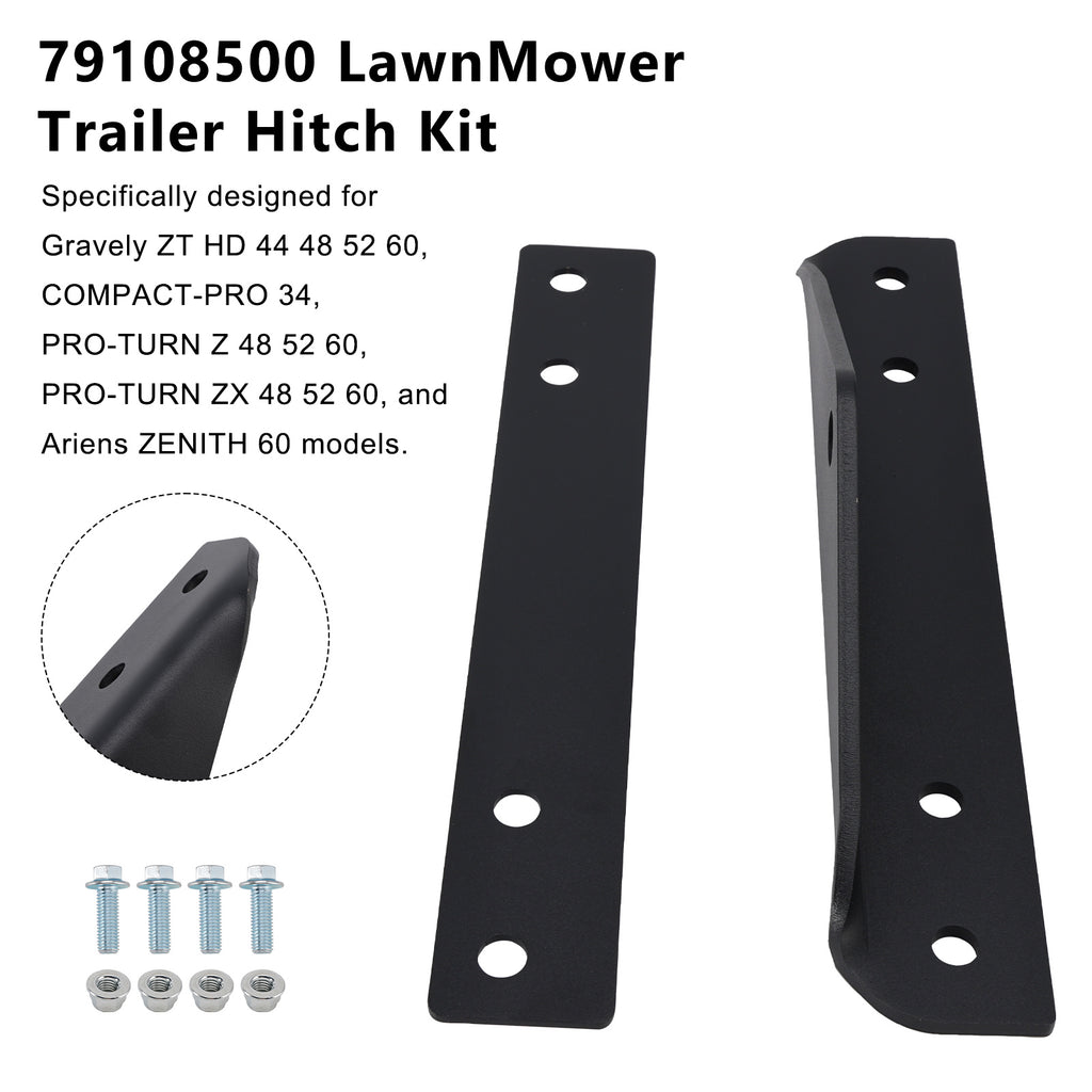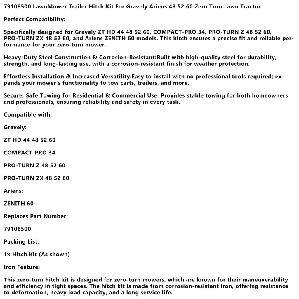 Specifically designed for Gravely ZT HD 44 48 52 60, COMPACT-PRO 34, PRO-TURN Z 48 52 60, PRO-TURN ZX 48 52 60, and Ariens ZENITH 60 models. This hitch ensures a precise fit and reliable performance for your zero-turn mower.