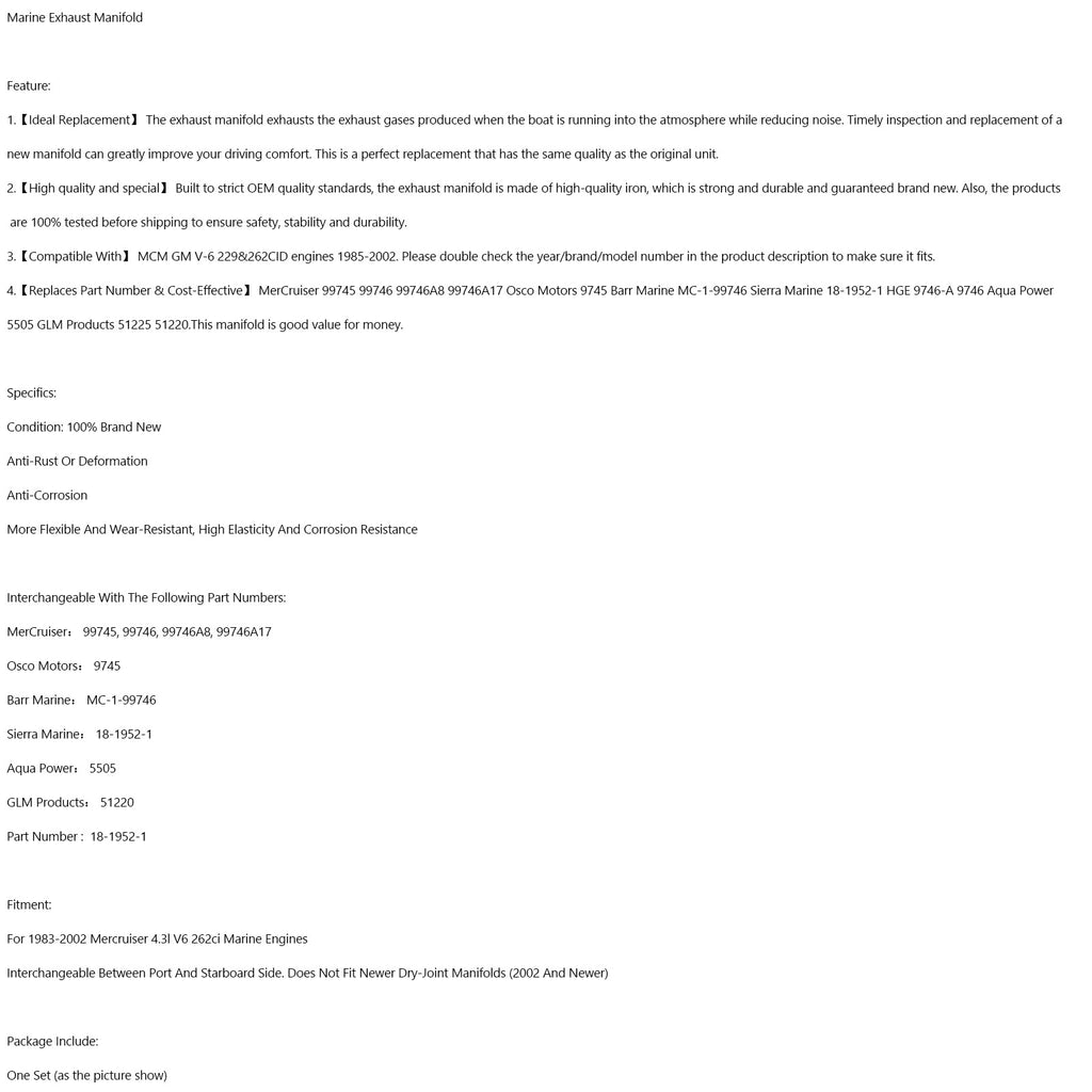 4.【Replaces Part Number & Cost-Effective】 MerCruiser 99745 99746 99746A8 99746A17 Osco Motors 9745 Barr Marine MC-1-99746 Sierra Marine 18-1952-1 HGE 9746-A 9746 Aqua Power 5505 GLM Products 51225 51220.This manifold is good value for money.