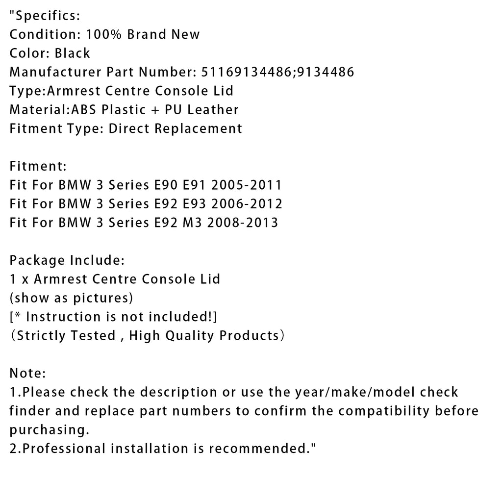 Black Leather Armrest Centre Console Lid For BMW E90 E91 E92 E93 51169134486
