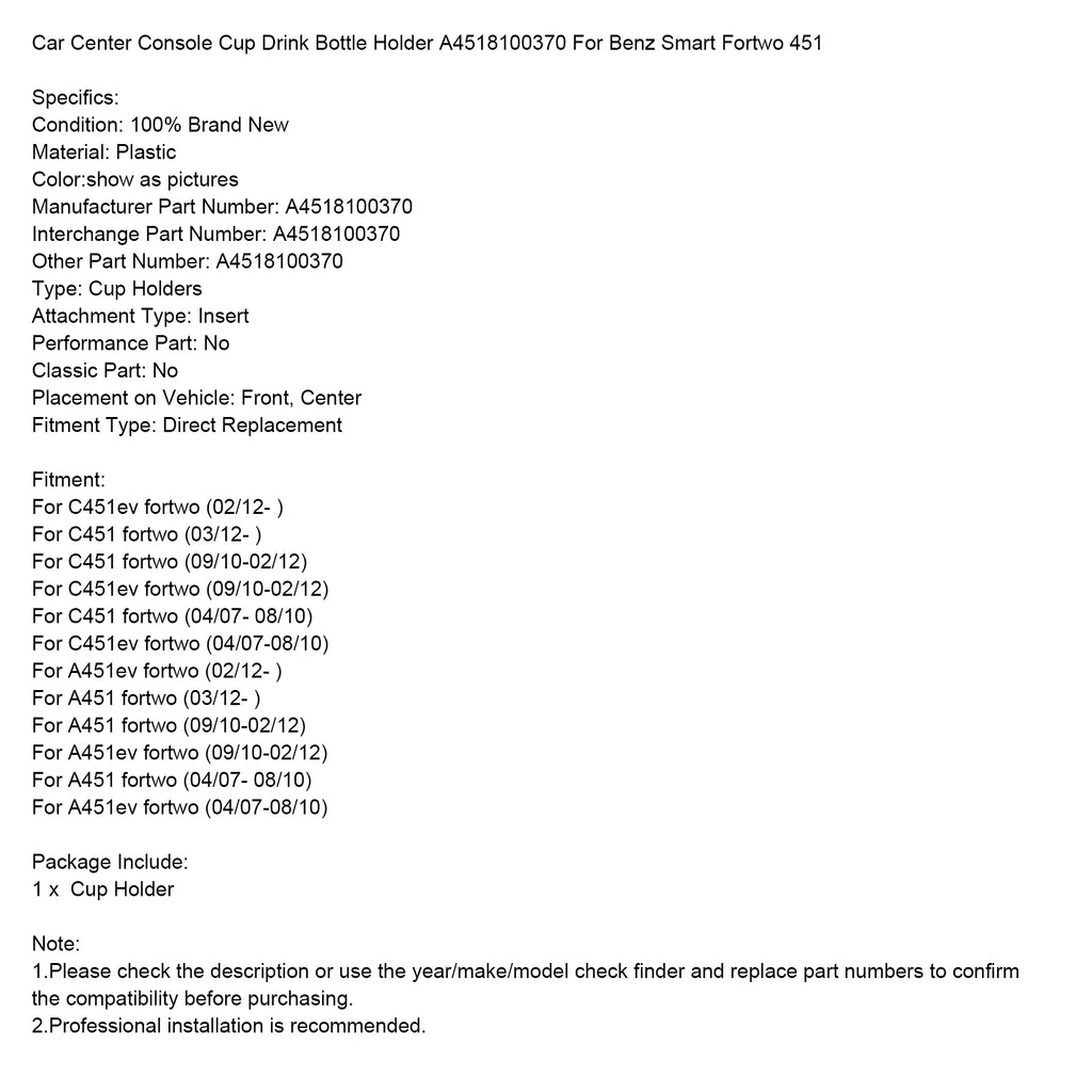 Car Center Console Cup Drink Bottle Holder A4518100370 For Benz Smart Fortwo 451