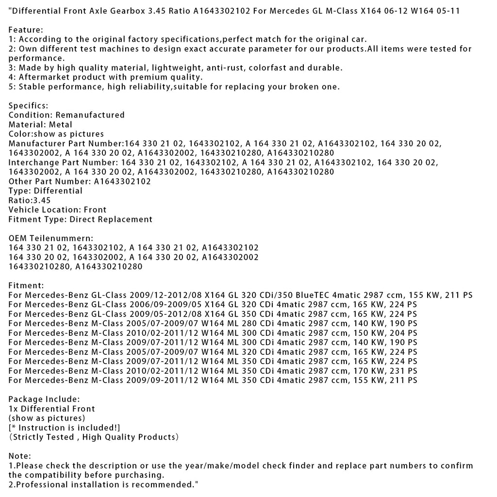 Differential Front Axle Gearbox 3.45 Ratio A1643302102 For Mercedes GL M-Class X164 06-12 W164 2005-2011
