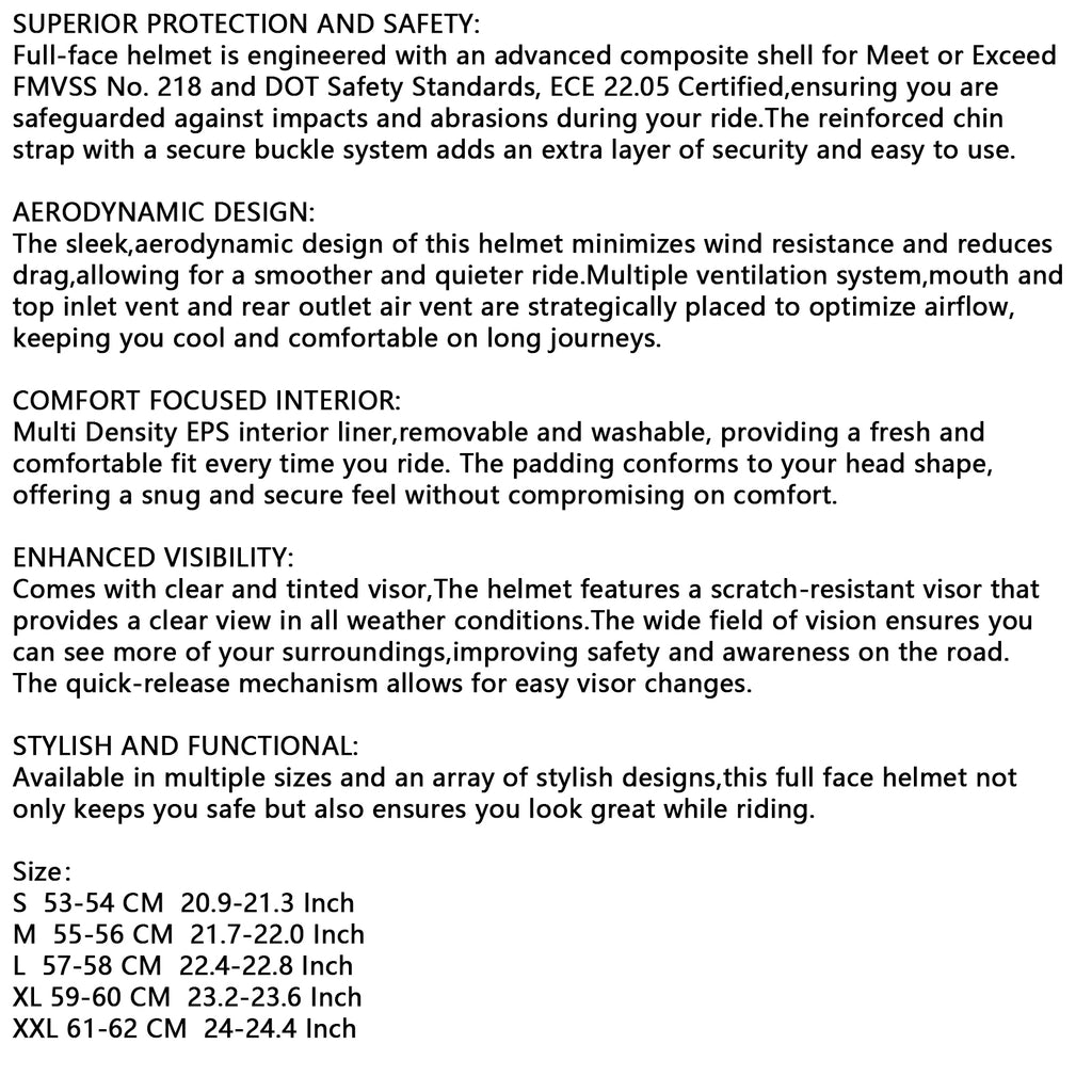 Full-face helmet is engineered with an advanced composite shell for Meet or Exceed FMVSS No. 218 and DOT Safety Standards, ECE 22.05 Certified,ensuring you are safeguarded against impacts and abrasions during your ride.The reinforced chin strap with a secure buckle system adds an extra layer of security and easy to use.