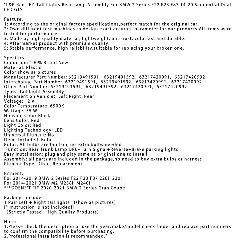 L&R Red LED Tail Lights Rear Lamp Assembly For BMW 2 Series F22 F23 F87 14-20 Sequential Dual LED GTS