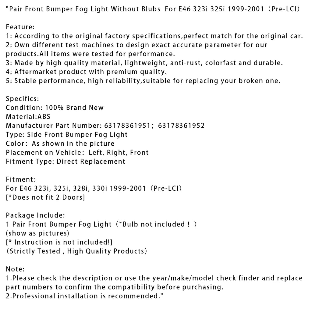 Pair Front Bumper Fog Light Without Blubs For E46 323i 325i 1999-2001(Pre-LCI)
